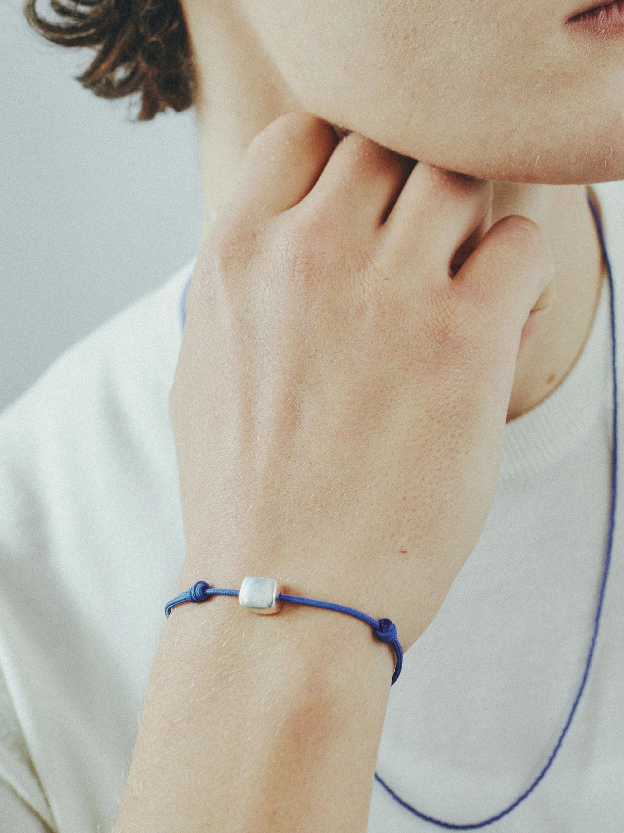 Durable Japanese string bracelet with a sleek silver cube. Minimal, strong, and subtly sculptural.