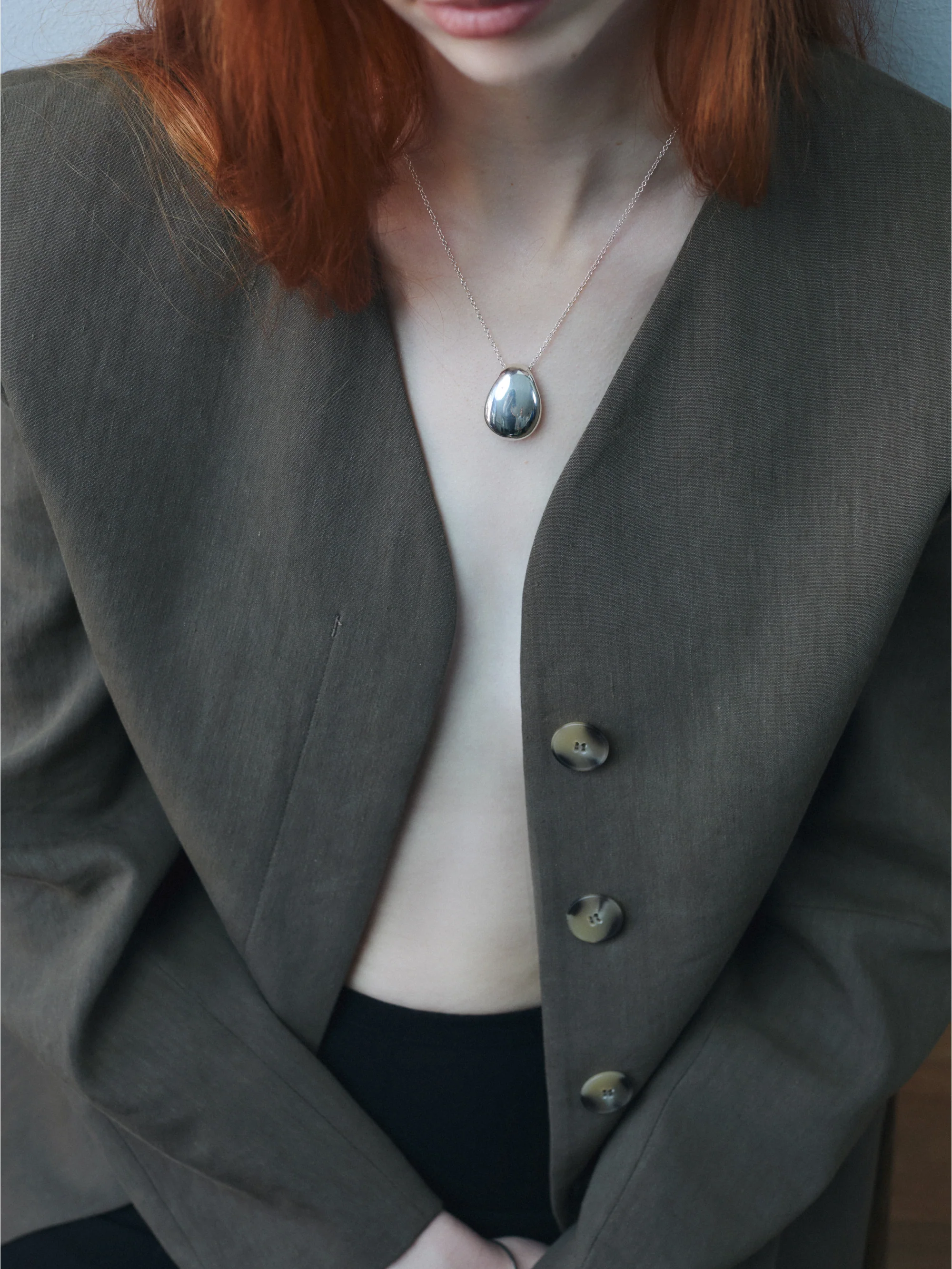 A polished silver egg with a mirrored surface, suspended from a fine chain. Glossy, sculptural, and perfectly smooth.