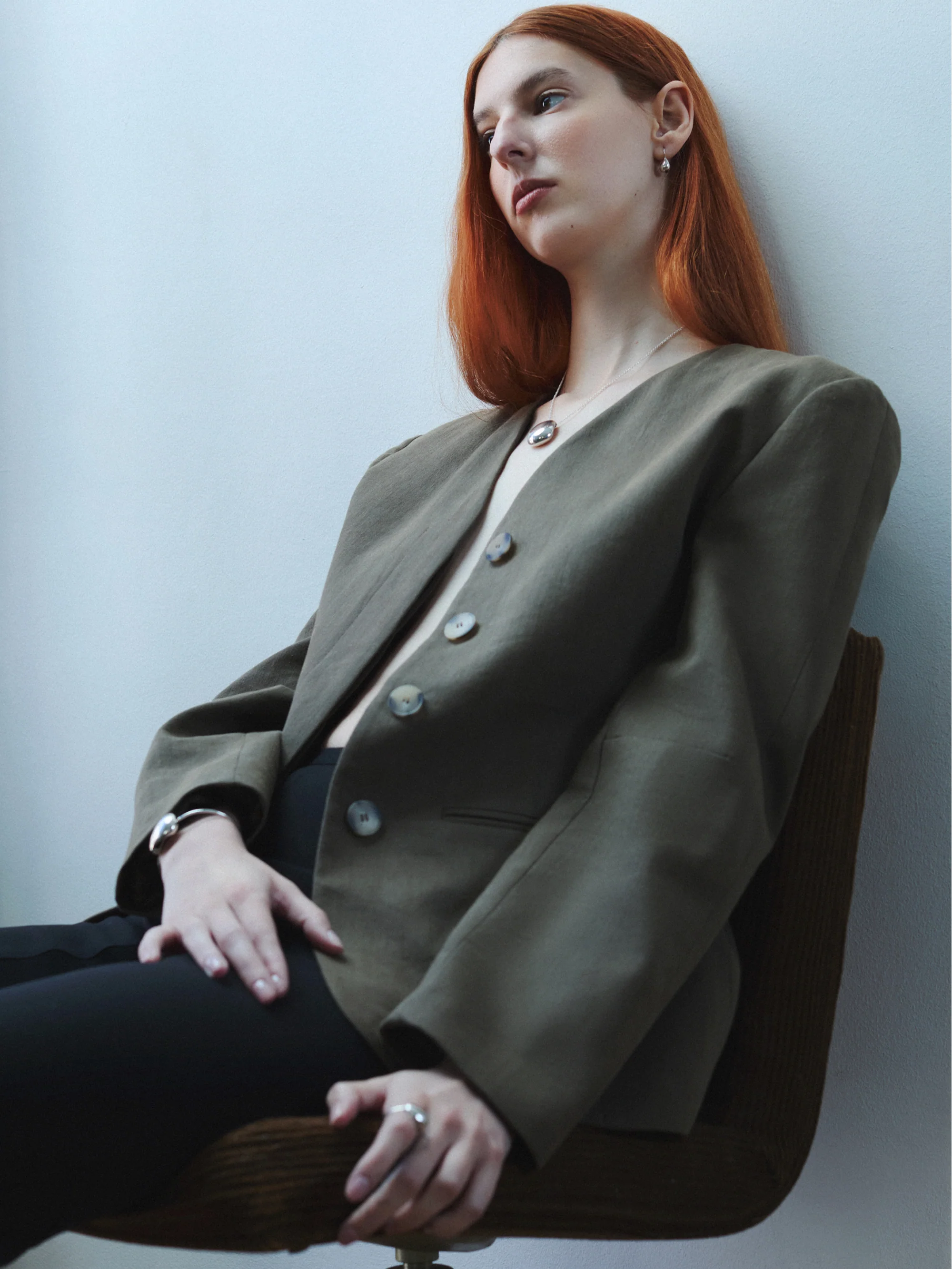 A bold silver egg on a delicate band. Its sleek, mirror-like surface catches light, making a simple yet powerful statement.