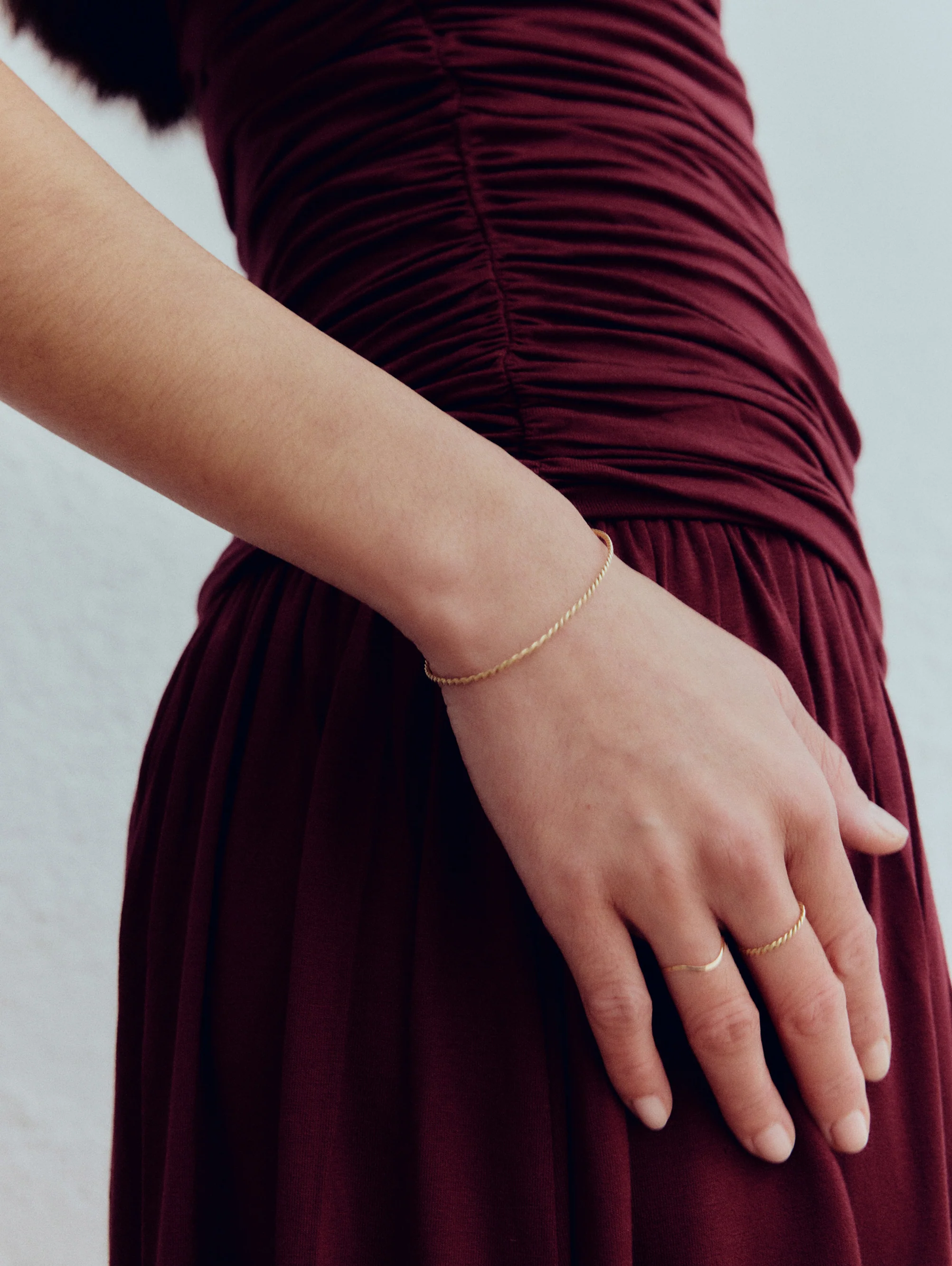 An open bracelet shaped from twisted 18k gold wire. Handmade from two fine threads turned into one, it slips on with ease while catching light in every movement.
