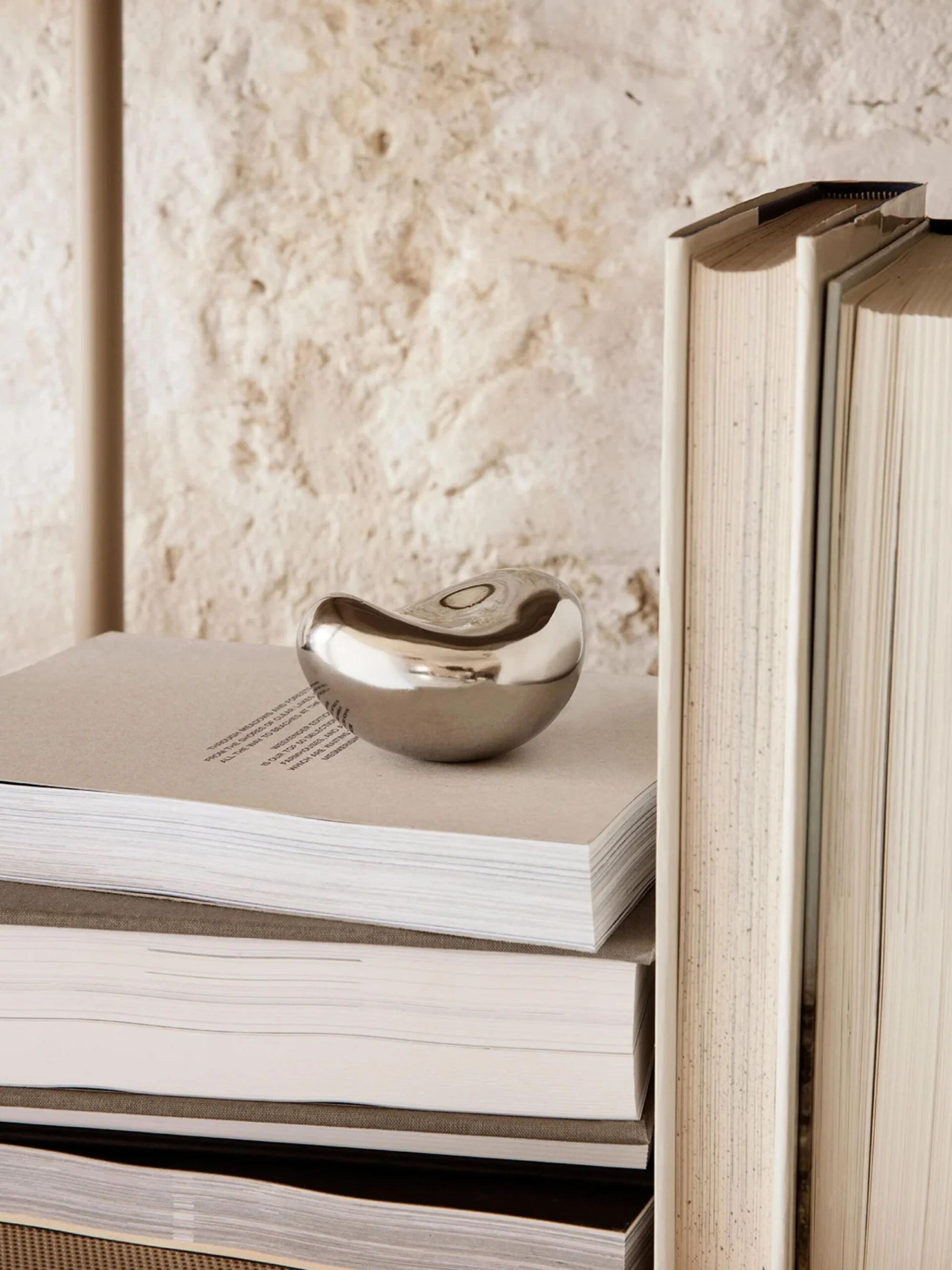 Lending a soft, feminine touch to metal, sculptural shapes rooted in nature are initially shaped by hand before being cast in stainless steel. This piece is formed with a concave shape, reminiscent of a smooth stone or an unfurled leaf. As a paperweight or standalone decoration, it adds a sense of natural beauty to a room. Engraved with the initials of both Helena Rohner and ferm LIVING, the collectible object comes packaged in a textile pouch.